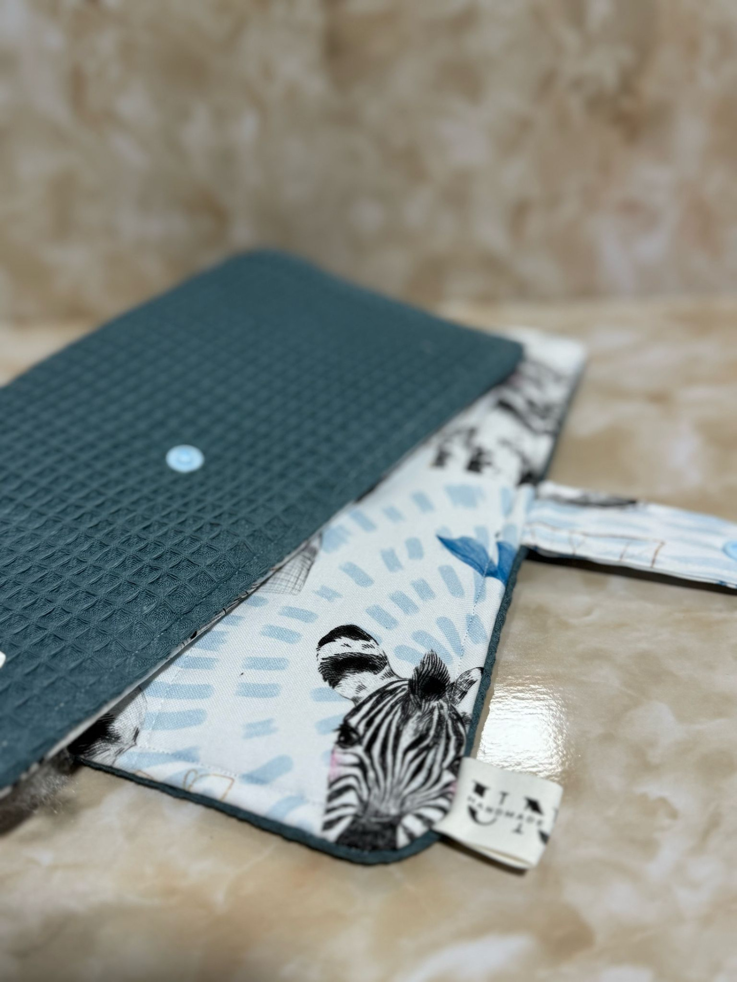 Portadocumentos en color Azul, con tela de algodón estampada y tela gofrada.